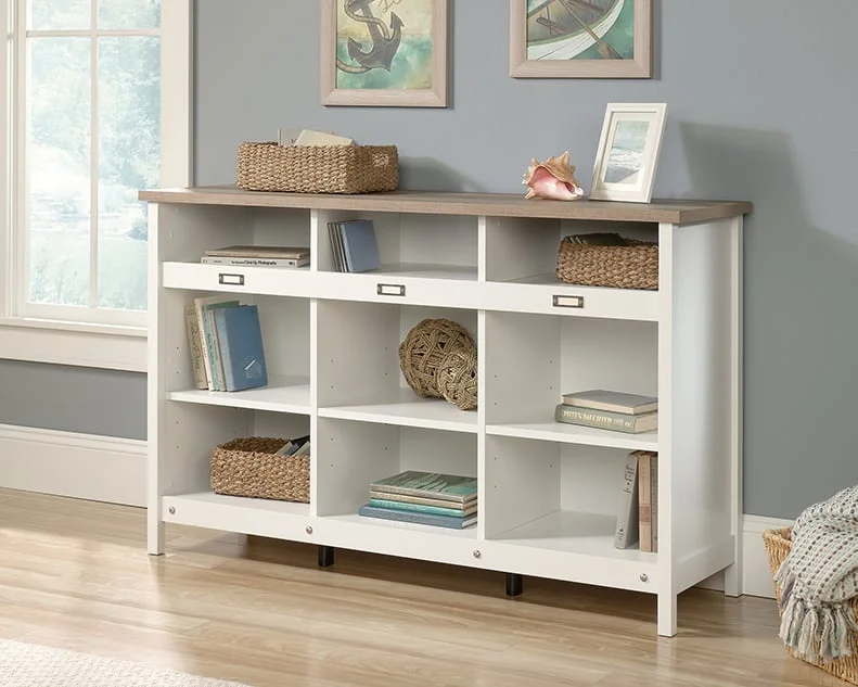 moreIs the clutter and chaos beginning to get a little out of hand in your home? Create the perfect solution for getting organized with this storage credenza from the Adept Storage collection. You can find a spot for all your stuff! This handy credenza features nine cubby hole storage areas that provide you with the perfect amount of room to stow away items like stacks of books, bins full of crafting supplies, photo albums and much more! It also accommodates ID label tags so you’ll always know where to find all your goodies. It features three adjustable shelves that have the ability to move to different heights to create flexible storage options for items of all shapes and sizes. Its large top surface provides you with an ideal amount of room to display home décor items like an accent lamp, decorative plants and picture frames too! Finished in Soft White® and detailed with a Lintel Oak® accent, this charming bookcase gives you the style and functionality you need in any room of your home.
