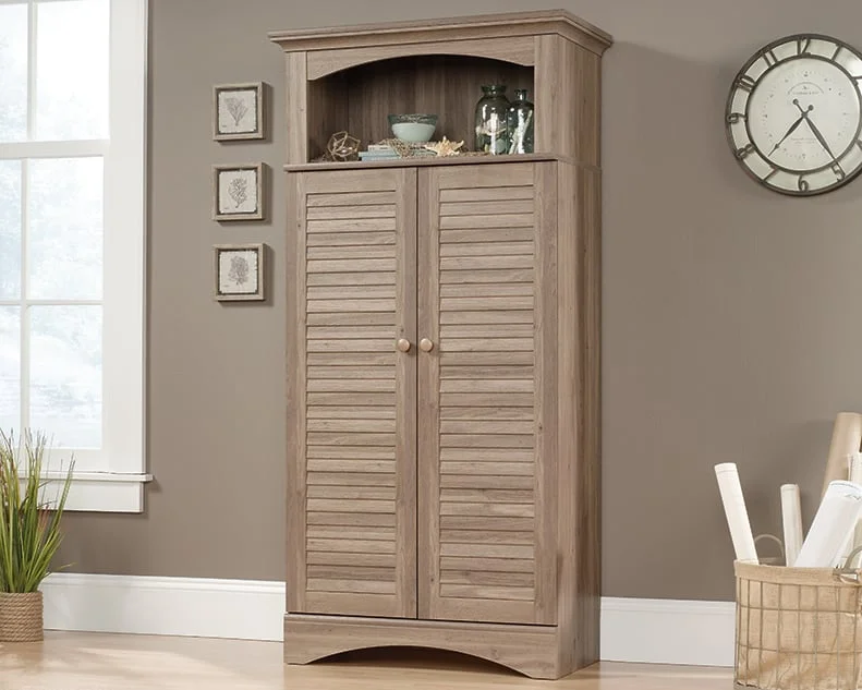 Hidden storage behind louver detailed doors because everyone needs a place to hide their clutter and chaos. Concealed storage features one fixed shelf and one adjustable shelf for flexible storage options. Open storage features full upper shelf for your favorite home décor. Tip restraint safety strap included because we care about you and your family. Detailing includes solid wood knobs. Salt Oak® finish.